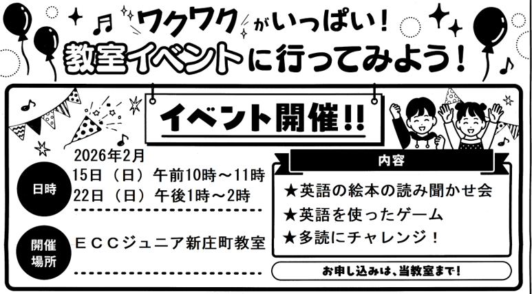 ECCジュニア新庄町教室の2月のイベント、「英語の絵本読み聞かせ」を以下の日程で開催いたします!絵本の読み聞かせの他にも「英語を使ったのゲーム」や「多読にチャレンジ」といった楽しい内容のイベントを予定しています。子どもたちに楽しい英語学習のきっかけとなってくれたら嬉しく思います。参加希望の方は講師までご予約ください!